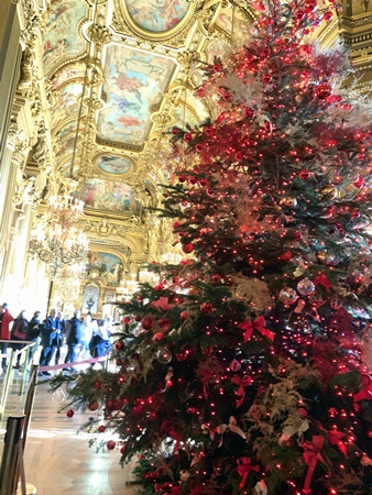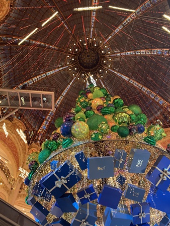 パリにあるデパートギャラリー・ラファイエット本館の名物クリスマスツリー。上に飛び出ているはしごの部分で無料で写真を撮ってくれるサービスがあって撮ってもらいました。