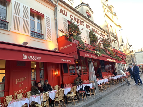 フランス3日目 パリに戻ってモンマルトルの丘へ。カフェもクリスマスの飾りが華やかです。