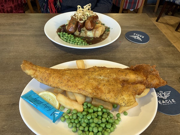 イギリスの名物のフィッシュ・アンド・チップスをコッツウォルズのパブで食べました。とんでもない量で娘と二人ではとても食べきれなかったです。奥はソーセージとマッシュポテト。