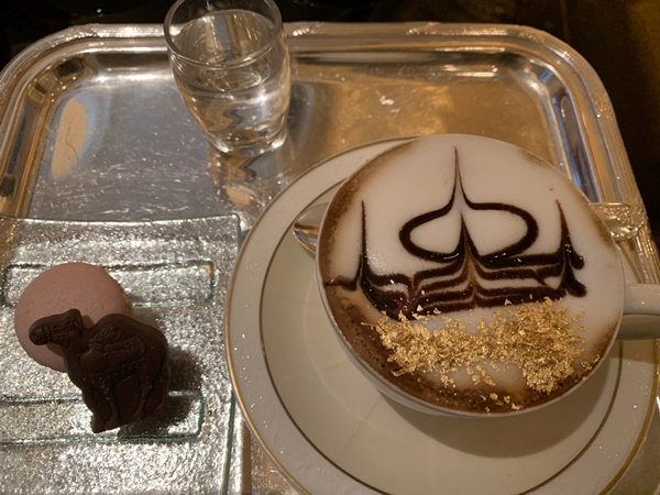 23金の金箔が乗った「エミレーツ・パレス・カプチーノ(60AED)」。日本円で約1,740円のカプチーノセットです。(別途サービス料10%、観光料金6%、自治体料金4%がかかります)