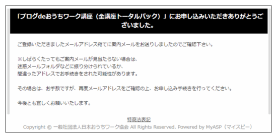 一般社団法人日本おうちワーク協会からの決済の、お知らせメールが届いているか確認して下さい。
